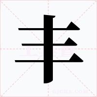 (象形。甲骨文字形,上面象一器物盛有玉形,下面是“豆”(古代盛器)。故“豐”本是盛有贵重物品的礼器。这由“豊”字可以得到证明。古文“豐与“豊”是同一个字,《说文》:“豊,行礼之器也。”本义:古代盛酒器的托盘)