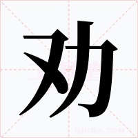(形声。从力,雚(guàn)声。简化字中“又”仅是一个符号。本义:勉励)