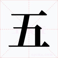 又如:五路总口(通往东、西、南、北、中五路的交叉口);五车腹笥(腹中装有五车书,比喻知识丰富,学问渊博);五方旗帜(按东、西、南、北、中五个方位,插上青、黄、赤、白、黑五色旗);五伯(春秋时先后称霸的齐桓公、晋文公、楚庄王、吴王阖闾、越王勾践。另一说指齐桓公、宋襄公、晋文公、秦穆公、楚庄王);五虫(鳞虫、羽虫、倮虫、毛虫、介虫的合称);五木(泛指古时的形具,如枷、镣、铐等);五浮(上等土壤);五细(指出身贱,年辈小,关系远,资历浅,地位低的五类人);五云(青、白、赤、黑、黄五种云色);五剽(白色粉状的中等土壤);五义(父义、母慈、兄友、弟恭、子孝)。又通“伍”
