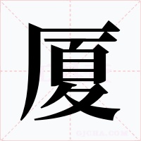 (厦俗作厦。古通作夏。形声。从广,夏声。广(yǎn)表示房屋。“夏”古有“大”的意思。见《尔雅·释诂》。本义:大屋子)