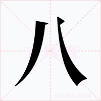 “八” 字共有 2 画,拼音:bā,注音:ㄅㄚ,部首:八,笔画数:2 画,字体结构:独体字,五行:水,五笔:WTY,Unicode编码:U+516B,郑码:OA,仓颉:HO,“八”字笔顺为:ノ丶