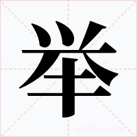 又如:举孝廉(荐举孝子和廉洁之士);举保(推荐,举荐);举主(古时推举贤者做官或参加考试,被荐者称荐者为举主)