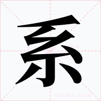 (“系”、“係”、“繫”三字的意义界限不清楚,故往往通用,且经传多以繫为之,只有世系的意义,只用“系”字。会意。甲骨文字形上面是“爪”,下面是“丝”。丝悬于掌中而下垂。本义:悬,挂)