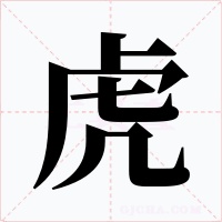 哺乳动物,毛黄褐色,有黑色条纹,性凶猛,力大。骨和血及内脏均可入药(通称“老虎”):虎口(a.喻危险境地;b.手上拇指和食指相交的地方)。虎穴(喻危险境地)。虎符(古代调兵的凭证,用铜铸成虎形,分两半)。虎狼(喻凶残的人)。虎头蛇尾。虎踞龙盘。龙腾虎跃。
