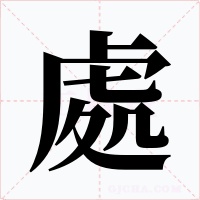 “處” 字共有 11 画,拼音:chǔ,注音:ㄔㄨˇ,部首:虍,笔画数:11 画,字体结构:左上包围结构,五行:金,五笔:HATM,Unicode编码:U+8655,郑码:IHRQ,仓颉:YPHEN,“處”字笔顺为:丨一フノ一フノフ丶ノフ