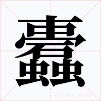 “蠹” 字共有 24 画,拼音:dù,注音:ㄉㄨˋ,部首:虫,笔画数:24 画,字体结构:上中下结构,五行:火,五笔:GKHJ,Unicode编码:U+8839,郑码:AJII,仓颉:JBMRI,“蠹”字笔顺为:一丨フ一丨丶フ一ノ丨フ一丨フ一丨一丶丨フ一丨一丶