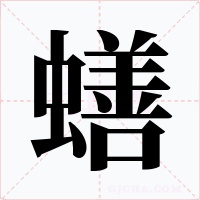 “蟮” 字共有 18 画,拼音:shàn,注音:ㄕㄢˋ,部首:虫,笔画数:18 画,字体结构:左右结构,五行:金,五笔:JUDK,Unicode编码:U+87EE,郑码:IUUJ,仓颉:LITTR,“蟮”字笔顺为:丨フ一丨一丶丶ノ一一一丨丶ノ一丨フ一