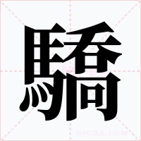 “驕” 字共有 22 画,拼音:jiāo,注音:ㄐㄧㄠ,部首:馬,笔画数:22 画,字体结构:左右结构,五行:火,五笔:CTDK,Unicode编码:U+9A55,郑码:CUJL,仓颉:SFHKB,“驕”字笔顺为:一丨一一丨フ丶丶丶丶ノ一ノ丶丨フ一丨フ丨フ一