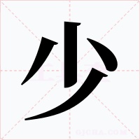又如:少房(妾);少母(儿子称父亲的妾);少姑(古代妻称夫的庶母为少姑);少妻(妾);少子(最小的儿子)