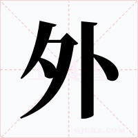 又如:外户(从外面关闭的大门);外祟(指外来的危害);外槨(棺材外的套棺);外好里枒槎(对外人好,对自己人苛刻);外藩(外部屏藩);外廓(外城);外见(显现于外);外求(求之于外);外舍(在外住宿)