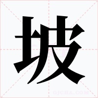 “坡” 字共有 8 画,拼音:pō,注音:ㄆㄛ,部首:土,笔画数:8 画,字体结构:左右结构,五行:土,五笔:FHCY,Unicode编码:U+5761,郑码:BXI,仓颉:GDHE,“坡”字笔顺为:一丨一フノ丨フ丶