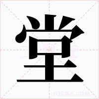 又如:堂轴(挂在厅堂壁上的字画);高堂(高大的厅堂);堂户(门庭之内);堂筵(堂中坐席);堂坳(堂的低处;泛指低洼之处);堂扁(厅堂上的题额);堂室(厅堂和内室);堂前(正房前面;正厅);堂房(堂和房)
