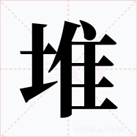 又如:堆堵(堆积堵塞);堆绢(堆纱花。用彩绢制成花鸟人物形状,缀附于屏障上);堆山塞海(形容财物极为丰富);堆红(漆器上所堆成的朱色花纹);堆案(累积案头。指积压很多文书)