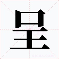 “呈” 字共有 7 画,拼音:chéng,注音:ㄔㄥˊ,部首:口,笔画数:7 画,字体结构:上下结构,五行:火,五笔:KGF,Unicode编码:U+5448,郑码:JCVV,仓颉:RHG,“呈”字笔顺为:丨フ一一一丨一