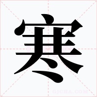(会意。金文外面是“宀”(mián),即房屋;中间是“人”;人的左右两边是四个“草”,表示很多;下面两横表示“冰”。寒冷是一种感觉,人们虽能感觉到,但是却看不见。于是古人就采用上述四个形体来创造这个字,人踡曲在室内,以草避寒,表示天气很冷。本义:冷,寒冷)