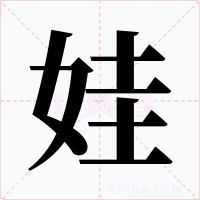 “娃” 字共有 9 画,拼音:wá,注音:ㄨㄚˊ,部首:女,笔画数:9 画,字体结构:左右结构,五行:土,五笔:VFFG,Unicode编码:U+5A03,郑码:ZMBB,仓颉:VGG,“娃”字笔顺为:フノ一一丨一一丨一