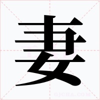 (会意。小篆字形从女,从屮,从又。“屮”象家具形,又是手。合起来象女子手拿家具从事劳动的形象。本义:男子的正式配偶)