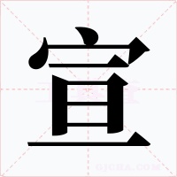 “宣” 字共有 9 画,拼音:xuān,注音:ㄒㄩㄢ,部首:宀,笔画数:9 画,字体结构:上下结构,五行:金,五笔:PGJG,Unicode编码:U+5BA3,郑码:WDBK,仓颉:JMAM,“宣”字笔顺为:丶丶フ一丨フ一一一