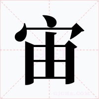 “宙” 字共有 8 画,拼音:zhòu,注音:ㄓㄡˋ,部首:宀,笔画数:8 画,字体结构:上下结构,五行:金,五笔:PMF,Unicode编码:U+5B99,郑码:WDKI,仓颉:JLW,“宙”字笔顺为:丶丶フ丨フ一丨一