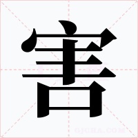 (会意。从宀(mián),从口,丰(gài)声。从“宀”、从“口”,意思是言从家起,而“言”又往往是危害的根源。本义:伤害,损害)