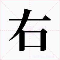 又如:右势下(右边;右旁);右个(右侧的偏室);右文(汉字形声字中右旁兼声义者称为右文);右文说(文字学上一种从声符求字义的学说,形声字大都声旁在右)