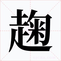 “趜” 字共有 15 画,拼音:jú,注音:ㄐㄩˊ,部首:走,笔画数:15 画,字体结构:左下包围结构,五行:火,五笔:FHQO,Unicode编码:U+8D9C,郑码:BORU,仓颉:GOPFD,“趜”字笔顺为:一丨一丨一ノ丶ノフ丶ノ一丨ノ丶