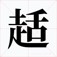 “趏” 字共有 13 画,拼音:guā,huó,注音:ㄍㄨㄚ,ㄏㄨㄛˊ,部首:走,笔画数:13 画,字体结构:左下包围结构,五行:木,五笔:FHTD,Unicode编码:U+8D8F,郑码:BOMI,仓颉:GOHJR,“趏”字笔顺为:一丨一丨一ノ丶ノ一丨丨フ一