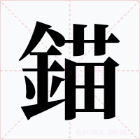 “錨” 字共有 16 画,拼音:máo,注音:ㄇㄠˊ,部首:釒,笔画数:16 画,字体结构:左右结构,五行:金,五笔:QALG,Unicode编码:U+9328,郑码:PEKI,仓颉:CTW,“錨”字笔顺为:ノ丶一一丨丶ノ一一丨丨丨フ一丨一