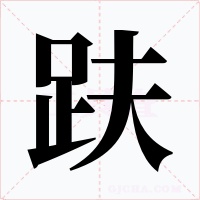 两足交叠而坐〖sitcross-leggedon〗。如:跌坐(盘腿而坐);趺足(脚心朝上、脚背朝下盘起腿来);趺跏(双足交叠而坐)