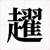 “趯” 字共有 21 画,拼音:tì,yuè,注音:ㄊㄧˋ,ㄩㄝˋ,部首:走,笔画数:21 画,字体结构:左下包围结构,五行:火,五笔:FHNY,Unicode编码:U+8DAF,郑码:BOYN,仓颉:GOSMG,“趯”字笔顺为:一丨一丨一ノ丶フ丶一フ丶一ノ丨丶一一一丨一