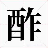 “酢” 字共有 12 画,拼音:zuò,注音:ㄗㄨㄛˋ,部首:酉,笔画数:12 画,字体结构:左右结构,五行:金,五笔:SGTF,Unicode编码:U+9162,郑码:FDMI,仓颉:MWOS,“酢”字笔顺为:一丨フノフ一一ノ一丨一一