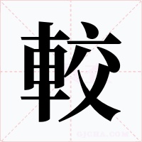 “較” 字共有 13 画,拼音:jiào,注音:ㄐㄧㄠˋ,部首:車,笔画数:13 画,字体结构:左右结构,五行:火,五笔:LUQY,Unicode编码:U+8F03,郑码:FKOO,仓颉:JJYCK,“較”字笔顺为:一丨フ一一一丨丶一ノ丶ノ丶