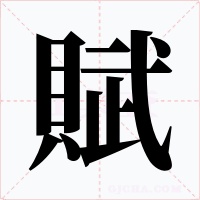“賦” 字共有 15 画,拼音:fù,注音:ㄈㄨˋ,部首:貝,笔画数:15 画,字体结构:左右结构,五行:水,五笔:MGAH,Unicode编码:U+8CE6,郑码:LOHI,仓颉:BCMPM,“賦”字笔顺为:丨フ一一一ノ丶一一丨一丨一フ丶