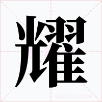 又如:耀目晶光(光彩夺目);耀夜(萤火虫的别名);耀芒(光芒照射);耀采(光彩照耀);耀亮(照亮);耀燿(光辉照耀)