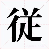 “従” 字共有 10 画,拼音:cóng,注音:ㄘㄨㄥˊ,部首:彳,笔画数:10 画,字体结构:左右结构,五行:火,五笔:TUHY,Unicode编码:U+5F93,郑码:OIUI,仓颉:HOTYO,“従”字笔顺为:ノノ丨丶ノ一丨一ノ丶