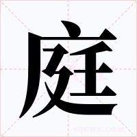 又如:庭闱(原指父母居住的地方。借指庭院或家庭);庭帏(庭闱);庭燎(举行大典礼时设在庭院中照明的火炬);庭轩(庭院中的小室);庭芜(庭园中丛生的草);庭阈(泛指庭院)