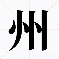 (会意。甲骨文字形,两边的曲折线象河流,中间象水中的陆地。“州”是“洲”的本字。小篆字形象两个“川”字相重合。本义:水中的陆地)