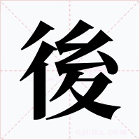 “後” 字共有 9 画,拼音:hòu,注音:ㄏㄡˋ,部首:彳,笔画数:9 画,字体结构:左右结构,五行:木,五笔:TXTY,Unicode编码:U+5F8C,郑码:OIZR,仓颉:HOVIE,“後”字笔顺为:ノノ丨フフ丶ノフ丶