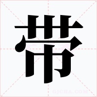 又如:带冕(大带和冠冕);带围(腰围,腰带);带钩(皮革腰带上的金属钩。形状一端曲直,另一端为圆钮以承钩。有动物形的,也有铸花纹的);带头(旧时衣袍外腰带上的扣头,常镶以金、玉等装饰物)