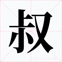 又如:叔伯姆(妯娌);叔翁(父亲的叔父,即“叔祖”)。或常用于对男性年长者(如对家庭的密友)的客气的亲切的称呼。如:叔侄;大叔;对中年男子的尊称。犹言“阿叔”