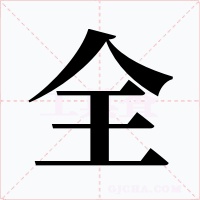 又如:全装贯带(全副武装);全副(全套);全家;全甲(全部披甲的士兵);全仗(全部的仪仗兵卫;完全依靠);全兵(军队全部以弓矛等兵器武装);全舍(全部舍弃);全批(统统);全全(全部;统统);全周(周全;全面);全争(不动一卒,不攻一城,完全用智谋使敌降伏);全别(完全变了样,完全不一样);全制(完全控制);全遂(完全遵从);全错;全怪我;全无心肝;全完(全部缴纳);全旨(全部的意蕴、含义);全通(全部通晓);全量(全部,所有);全灶(全能的厨师);全行(全部);全副(整个);全宗(整个宗族);全批(全体);全颗(一群人的全体);全额(全部规定的数目)
