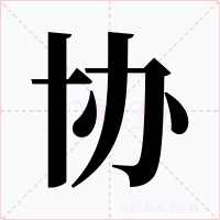 帮助〖assist〗。如:协饷(由税收富裕的省调济拨款协助贫困省);协济(接济);协飞熊(相传周文王梦见飞熊,占卜得要贤臣。后果遇姜尚。比喻帝王得贤之征兆)