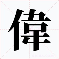 “偉” 字共有 11 画,拼音:wěi,注音:ㄨㄟˇ,部首:亻,笔画数:11 画,字体结构:左右结构,五行:金,五笔:WNHH,Unicode编码:U+5049,郑码:NXJM,仓颉:ODMQ,“偉”字笔顺为:ノ丨フ丨一丨フ一一フ丨