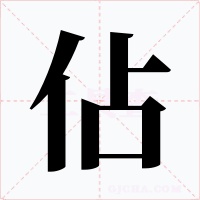 “佔” 字共有 7 画,拼音:zhàn,注音:ㄓㄢˋ|ㄉㄧㄢ,部首:亻,笔画数:7 画,字体结构:左右结构,五行:火,五笔:WHKG,Unicode编码:U+4F54,郑码:NIJ,仓颉:OYR,“佔”字笔顺为:ノ丨丨一丨フ一
