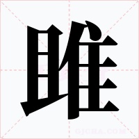 “雎” 字共有 13 画,拼音:jū,注音:ㄐㄩ,部首:隹,笔画数:13 画,字体结构:左右结构,五行:木,五笔:EGWY,Unicode编码:U+96CE,郑码:LCNI,仓颉:BMOG,“雎”字笔顺为:丨フ一一一ノ丨丶一一一丨一