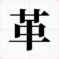 (象形。金文字形,象被剖剥下来的兽皮。中间的圆形物,是被剥下的兽身皮,余下的部分是兽的头、身和尾。“革”是汉字部首之一,从“革”的字多与皮革有关。本义:去毛的兽皮)