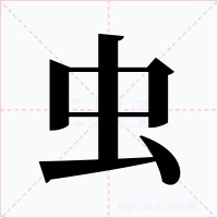(会意。汉字部首之一,从“虫”的字多与昆虫、蛇等有关。按:“虫”甲骨文字形象蛇形,本读huǐ,即虺,是一种毒蛇。后为“蟲”的简体。本义:昆虫的通称)