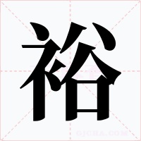 “裕” 字共有 12 画,拼音:yù,注音:ㄩˋ,部首:衤,笔画数:12 画,字体结构:左右结构,五行:金,五笔:PUWK,Unicode编码:U+88D5,郑码:WTOJ,仓颉:LCOR,“裕”字笔顺为:丶フ丨ノ丶ノ丶ノ丶丨フ一