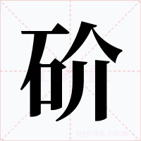 “砎” 字共有 9 画,拼音:jiè,注音:ㄐㄧㄝˋ,部首:石,笔画数:9 画,字体结构:左右结构,五行:火,五笔:DWJH,Unicode编码:U+780E,郑码:GOND,仓颉:MROLL,“砎”字笔顺为:一ノ丨フ一ノ丶ノ丨