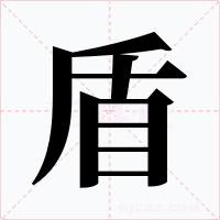 又如:盾威(指军心士气);盾矛(矛盾);盾橹(古代防护兵器);盾鼻(盾牌的把手);盾墨(盾鼻上磨墨)